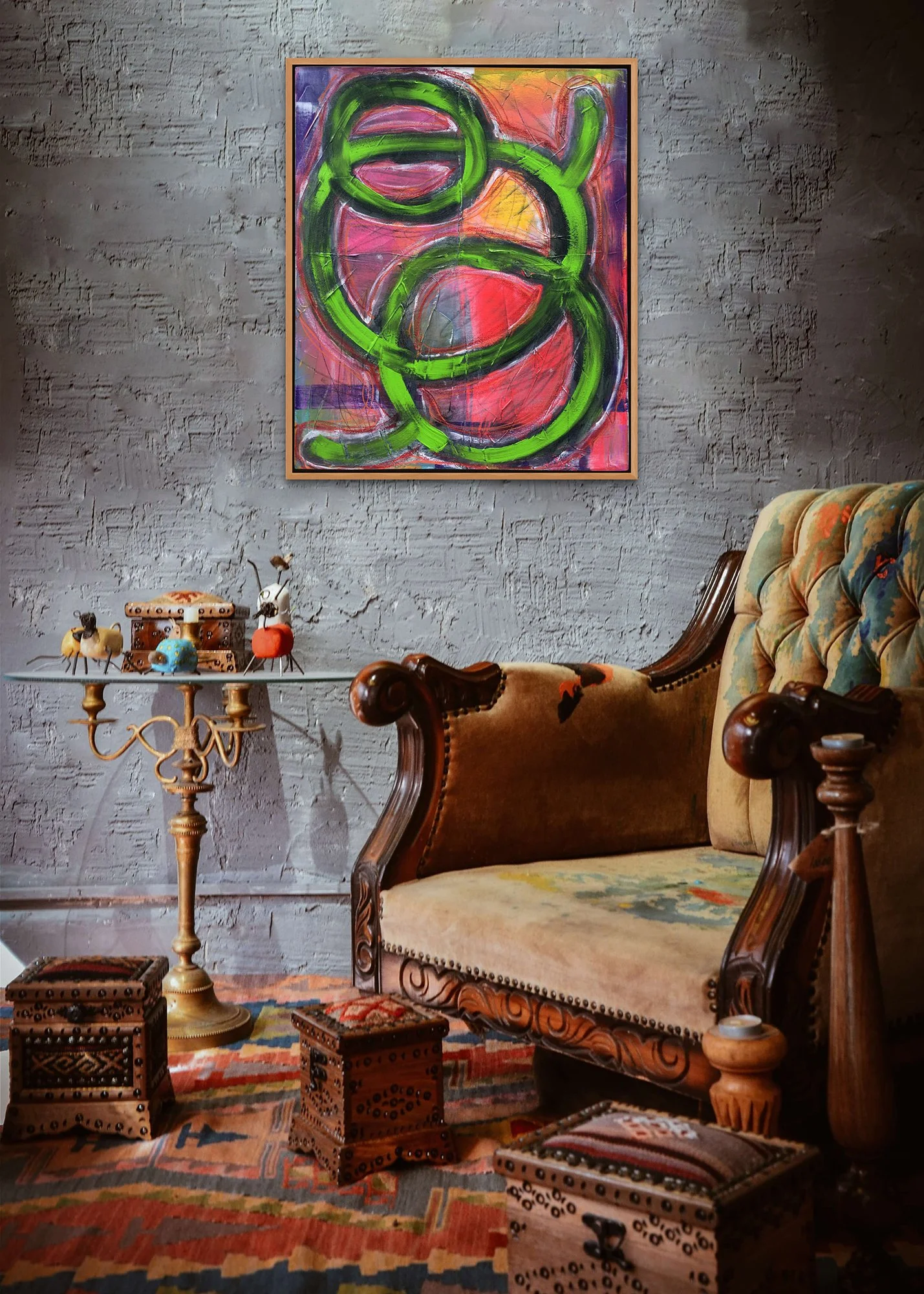 Acrylic paint, crayon, charcoal, oil pastels on canvas