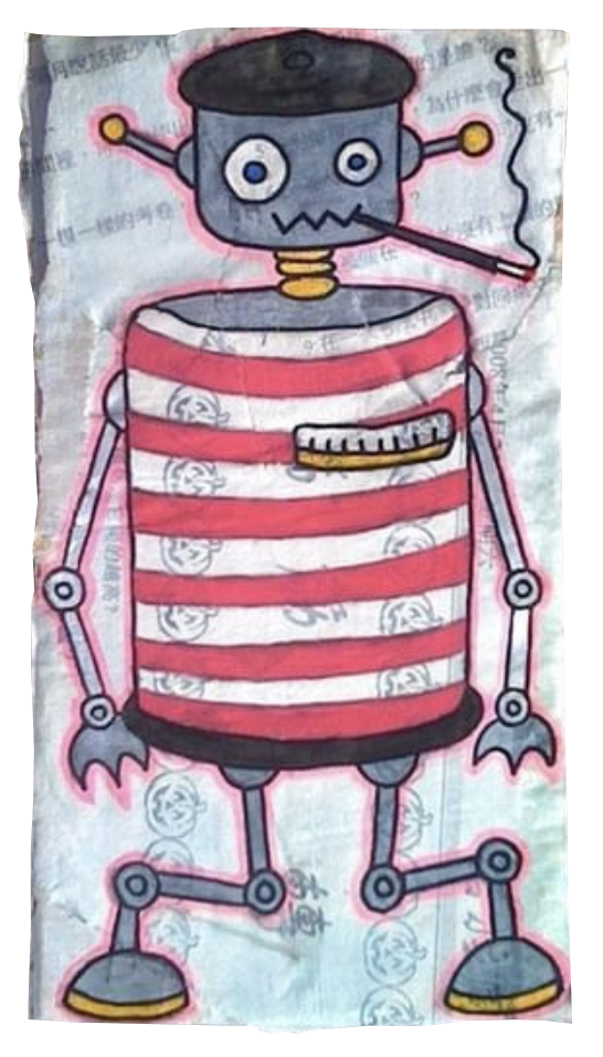 Watercolor marker and acrylic paint on cardboard covered with newsprint