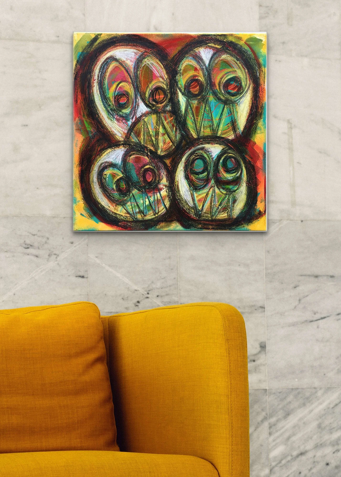 Acrylic paint, charcoal, oil pastel, and pencil on canvas