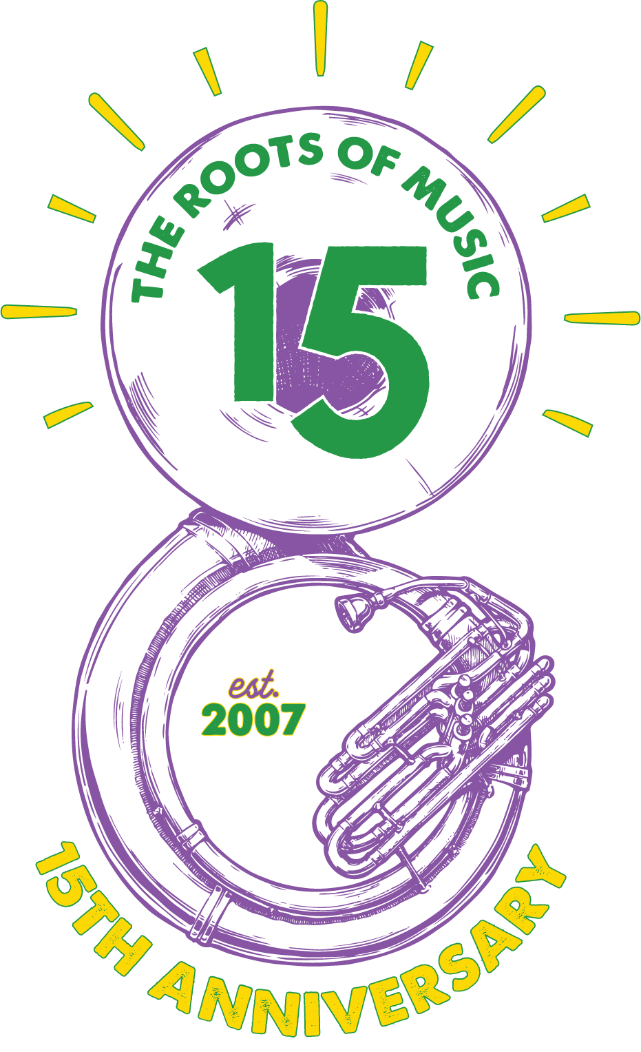 15th anniversary special edition Mardi Gras shirt design for The Roots of Music