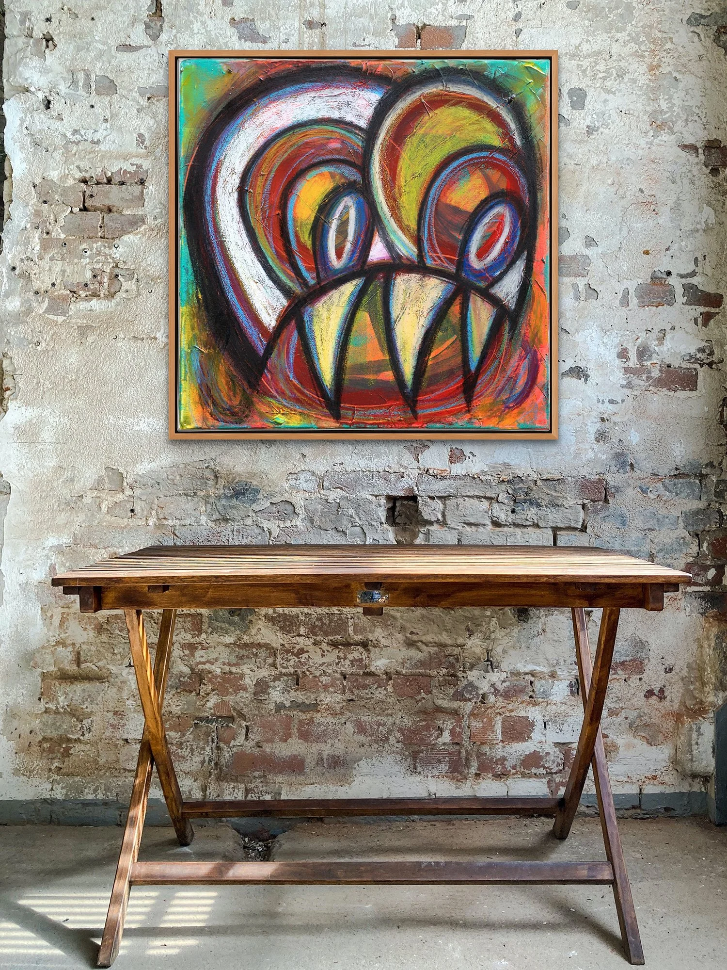Acrylic paint, charcoal, oil pastel, and pencil on canvas