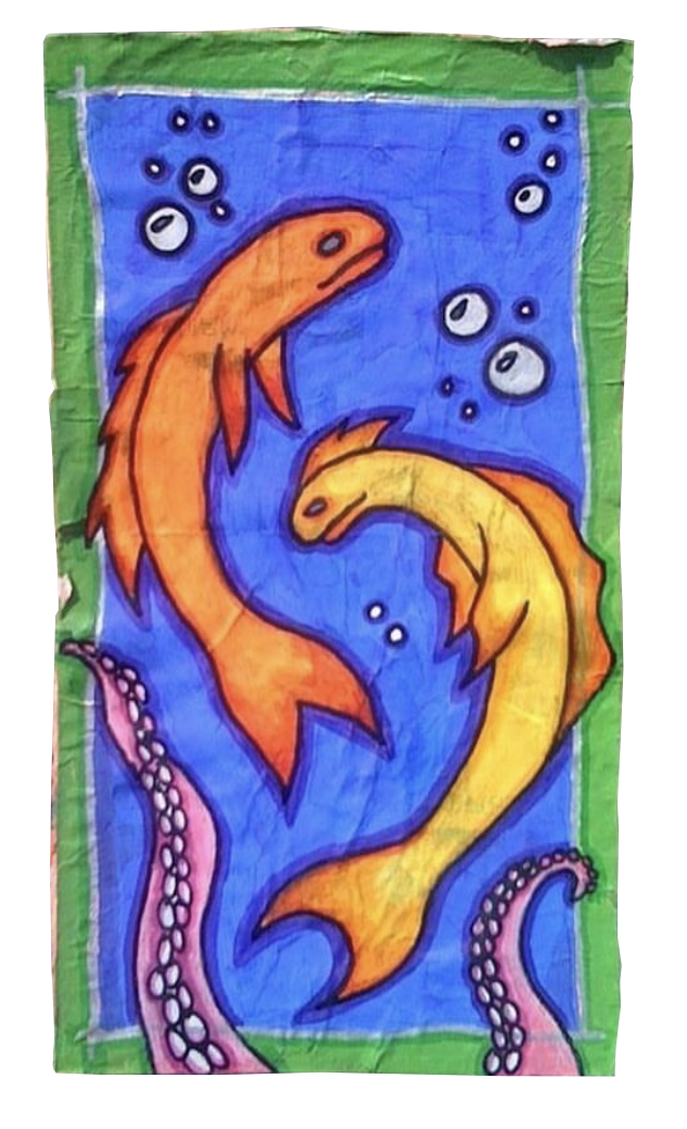 Watercolor marker and acrylic paint on cardboard covered with newsprint